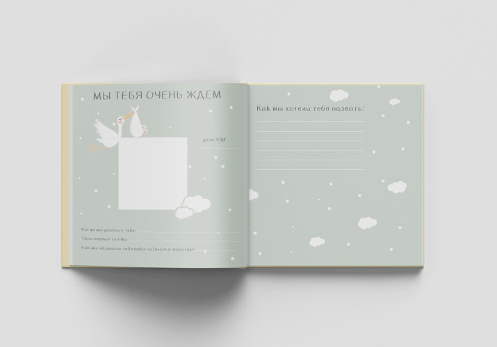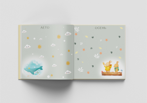 Дизайн сезонных страниц и основных этапов роста ребенка. В завершении, страница со строчками для письма в будущее и место для конверта на любой случай.