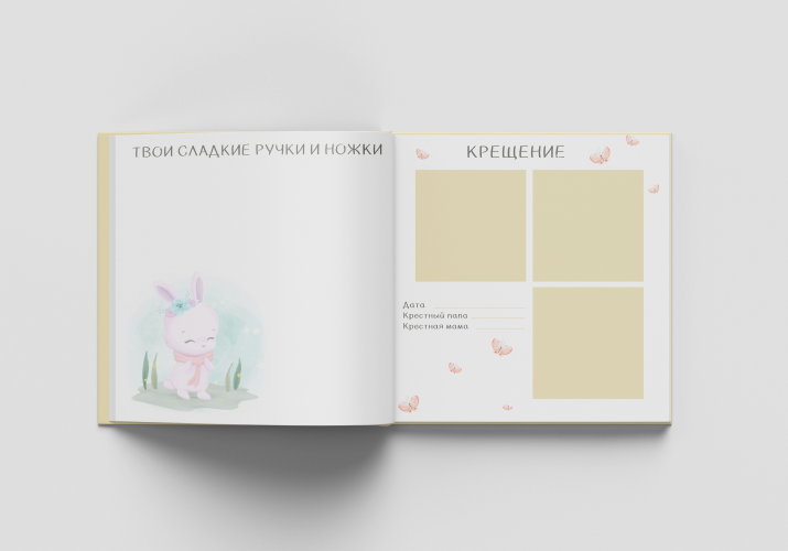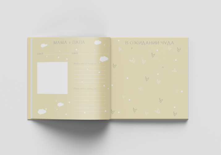 Разработаны странички для фото мамы и папы. Страница до рождения, после рождения. Страницы для фото в процессе обучения и разворот фотографий с крещения.