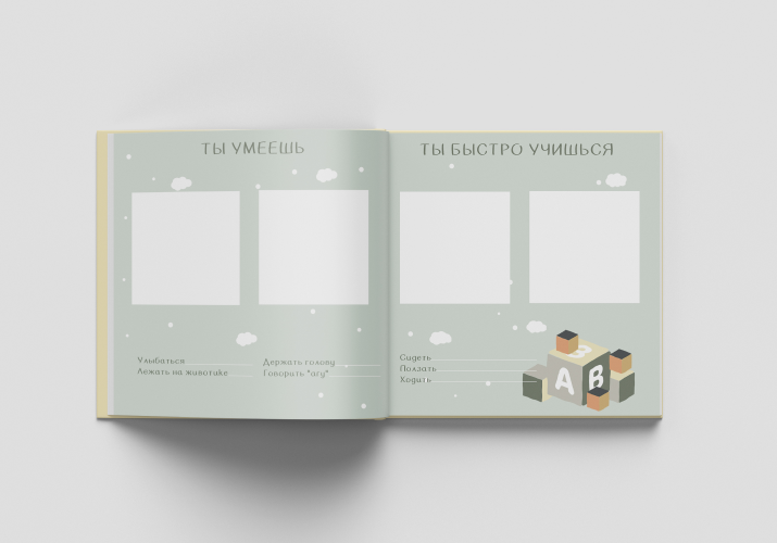 Основа - страницы с первыми 12 месяцами. Так же, что бы владельцы "не забывали" об альбоме, в последний момент было принято решение добавить несколько разворотов с фото в период от 1-5 лет.